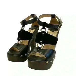 Jimmy Choo Ursula Wood leather suede platform sandal heels studded details