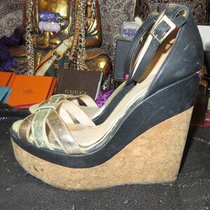 Jimmy Choo Vintage Luxury Italian Leather and Cork Ankle Strap Wedges Metallic