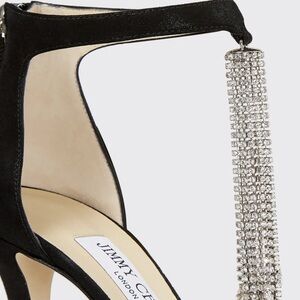 Jimmy Choo Viola Sandal Heel | Black Suede Leather with Silver Tassel
