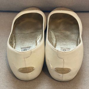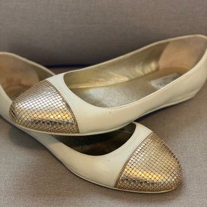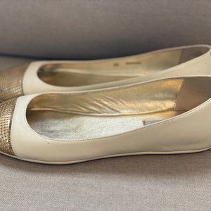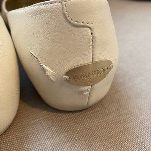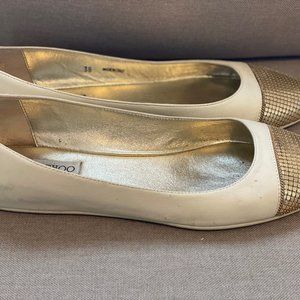 Jimmy Choo Waine leather ballet flats feature a gold tone chainmail metal cap toe and a back logo tab. They are really beautiful - a classic Jimmy Choo look - and very comfortable. Worn only a few times and still look great.