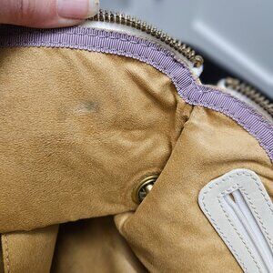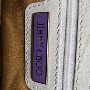 Elegant white clutch by Jimmy Choo. Features gold accents and a sleek design. Perfect for any occasion.