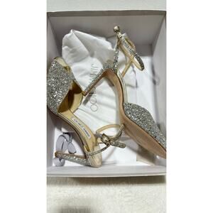 Shine with every step in these dazzling Jimmy Choo Sacora sandals. Featuring a sparkling champagne glitter finish and elegant crossover peep toe design, these heels exude timeless glamour. The ankle strap is adorned with shimmering stones for added sophistication, while the sturdy 85mm heel provides both height and comfort. Perfect for weddings, galas, or any occasion that calls for standout elegance.