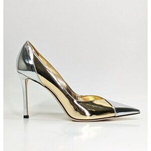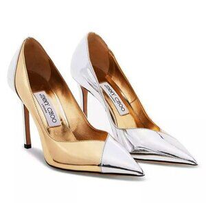 The Jimmy Choo Cass 95 Metallic Pointed Toe Pumps in Silver/Gold are elegant and stylish heels designed for women. These slip-on pumps feature a high stiletto heel, colorblock accents, and a breathable leather outsole. Ideal for occasions like weddings, parties, formal events, and business meetings during the summer, fall, and spring seasons. Crafted in Italy, these designer pumps by Jimmy Choo offer a luxurious and fashionable option for those seeking a sophisticated footwear choice.