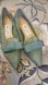 Chic teal lace gala sparkle flats by Jimmy Choo. Features a sparkling glitter bow. Ideal for elegant occasions. These are brand-new, authentic never-worn Jimmy Choo shoes with a black line on the bottom on the shoe. That’s why they’re so deeply discounted.