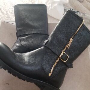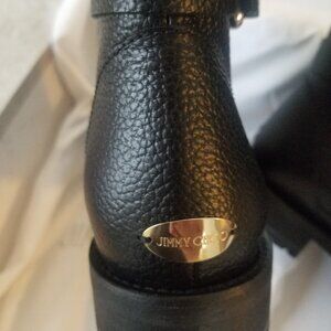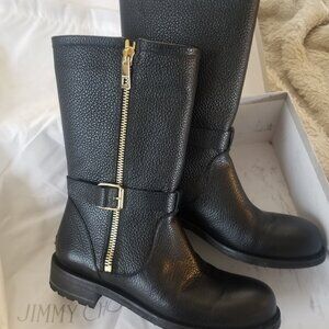Never-worn Jimmy Choo black leather biker boots with gold trim. In box. Beautiful boots for the fall/winter season. UPDATE...they are you size 8/38 but fit slightly narrow. Additional photos added for interested buyers.