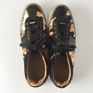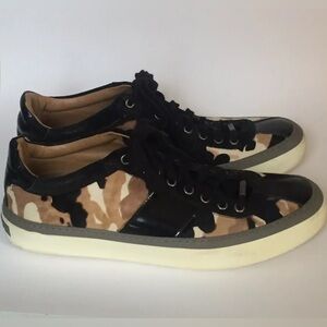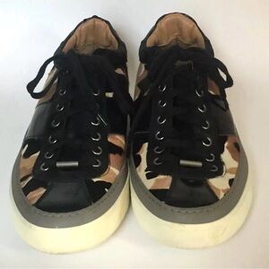 Chic men’s sneakers by jimmy Choo cowhide abstract camouflage print brown tan black ivory logo on back of heel logo on bottom of shoe