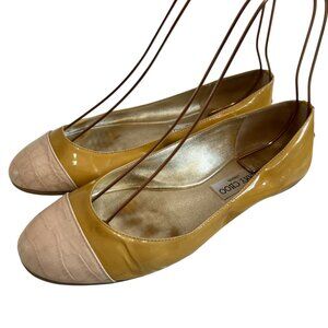 Jimmy Choo ballet flats, tan - beige patent leather with cream croc embossed cap toe, slip on, leather lining, rubber soles, IT 39 / US 9, preowned and is stretched, has scuffing throughout, wear/discoloration - see photos