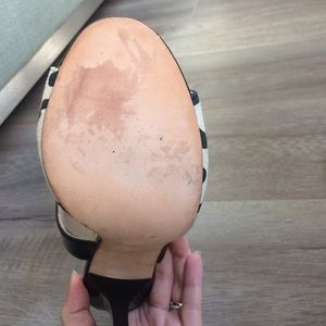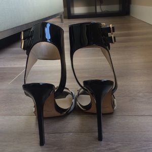 Patent leather and fabric high heels by Jimmy Choo for H&M. Never worn. Tried on at home and took a few steps, so minor marks on the bottom of the soles. Minor creasing from storage, but not noticeable when worn. EU size 36, and inside of shoe says that's a US five, but generally 36 is converted to size 6, which is how they fit.