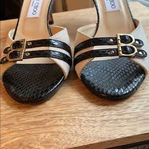 Beige and black kitten heel slides. Black is textured like snake print and beige is more like a canvas/linen color. Two small “buckles” gold tone. Heel is about 3”. Perfect for jeans, dresses, office etc... only worn 2 times.
