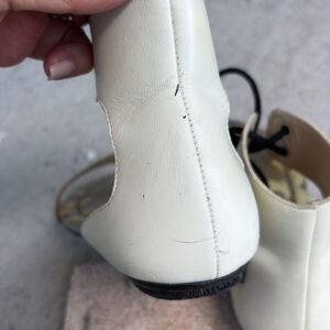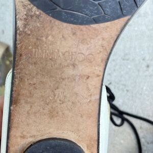 Please look at the pictures. The back of the left shoe needs some cleanup and the insole has worn away. Could either be stained or looks like camouflage right now. Sold as is and price accordingly.