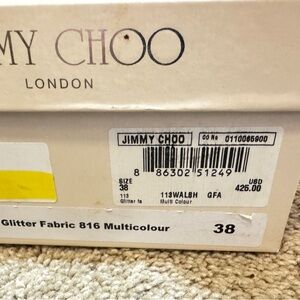 Jimmy Choo multi colored sparkling shoes with black insole. Size 8. In good condition, some wear. Super comfortable. Adds color to any outfit.