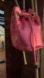 Chic pink metallic bag with drawstring closure. Features gold-tone logo and accents. Perfect for evening outings.