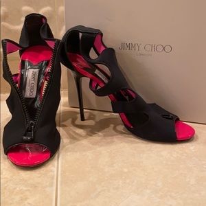 Jimmy Choo neoprene zipper heel. Yes, zippers work, easy on and off, comfortable fit. Hot pink and black. Heels are in great shape no dings, not loose, bottoms are dirty. Comes with box.