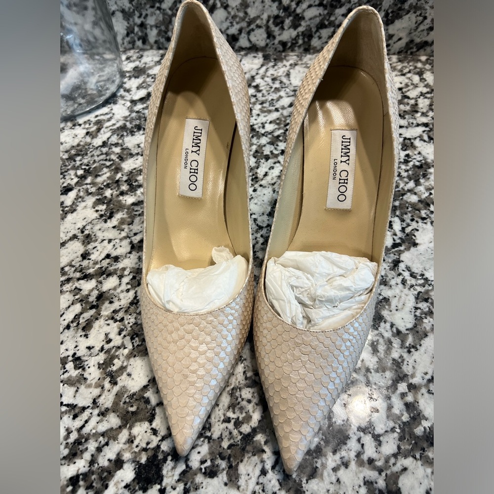 New! Never Worn. Jimmy Choo pumps in snake-effect leather. This pair has a classic pointed toe and is finished with a pretty iridescent coating and a glittered stiletto heel.