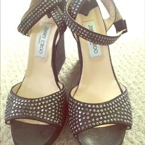 Beautiful rhinestone ankle strap wedges in black-pewter, metallic foiled grained leather. Effortlessly chic, yet comfortable. Finished with a buckle fastening ankle strap for added support. Made in Spain. Like new condition! Worn once!