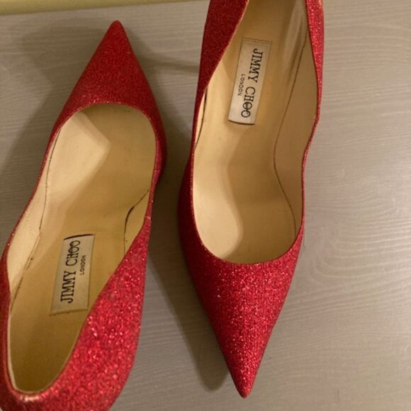 We are not in Kansas anymore. These ruby red sparkle pumps are sure to accentuate any holiday or festive outfit. Jimmy Choo is known for celebrity styles, and this one does not disappoint. Rare size 41.5.