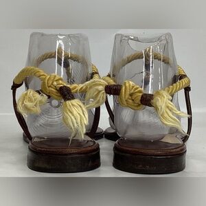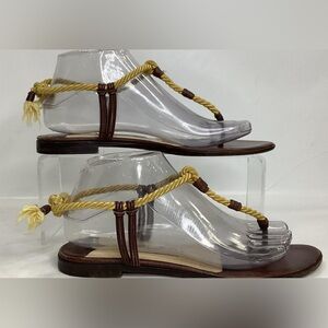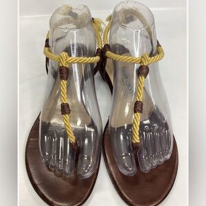 Stylish sandals with yellow rope detail. Brown leather base. Perfect for summer outings.