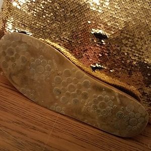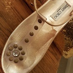 Sexy while in flat sandals by Jimmy Choo. RARE and hard to find in metallic colors with brass studs and rhinestone on see through acrylic design that decorates the foot beautifully!