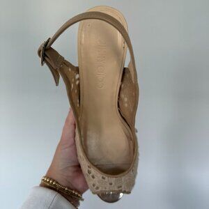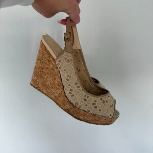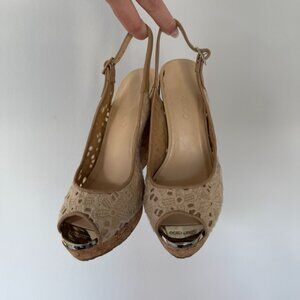Sling back strap wedge with open toe. Tan leather and cream eyelet fabric.