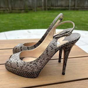 Jimmy Choo women Gray beige platform peep toe python Snakeskin strappy sexy neutral Heels 37.5 or 7.5 US