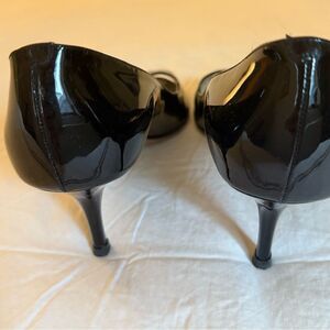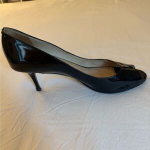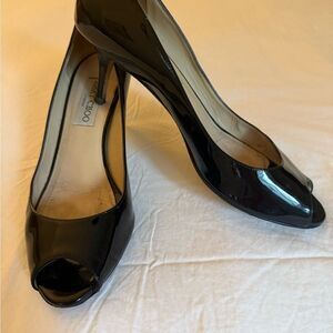 Jimmy Choo peep toe black patent leather mid heel pumps.