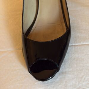 Jimmy Choo Black Patent Leather Mid Heel Peep Toe Pumps. Size 37.5.