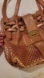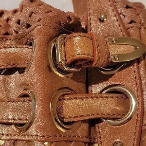 Elegant tan metallic leather shoulder bag. Features gold hardware and intricate detailing. clean inside. no flaws this bag is in excellent condition.