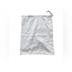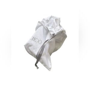 Elegant white dust bag with Jimmy Choo logo. Perfect for storing shoes or accessories.