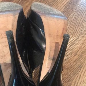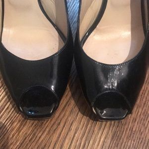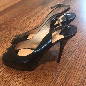Jimmy Choos patent leather , slingback, peep toe pumps. The heel taps probably need to be replaced soon. Great classic pump. Pictures show wear.