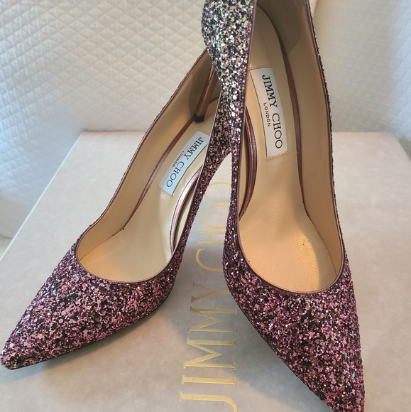 Pink and silver Jimmy Choo Romy gradient glittered leather pumps. Only wore once. Size is 40 , I absolutely loved these but I can't wear heels this high anymore because of a back and foot injury. Price includes a dust bag.