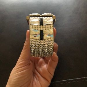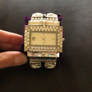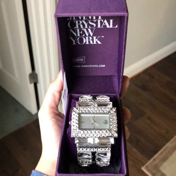 Embellished with Swarovski® crystals, which are set by Jimmy Crystal's expert craftsmanship. Mineral glass protects watch from scratches. Stainless steel case back. This watch is new and has never been worn. Pictures do not do this watch justice! Extra crystals are included in case one happens to fallout. Box included with purchase.