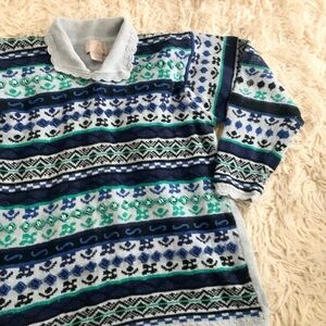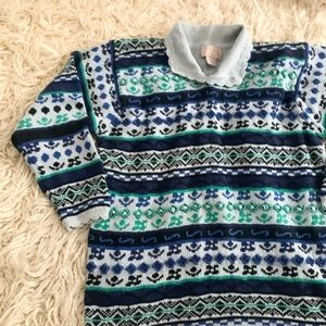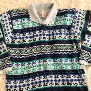 Jimmy Garcia | Vintage Knit Sweater Large Gray Blue Green Scallop Sleeve Hem Collar Pattern Striped