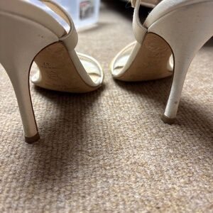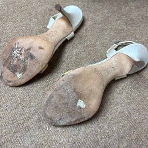 Worn wedding shoes beautiful white with gold accents. Satin and crystal.