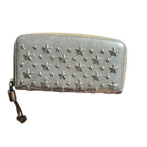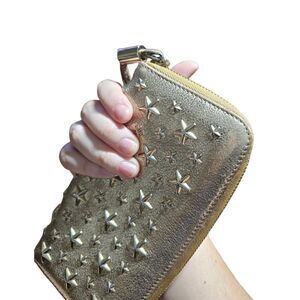 Introducing the exquisite Jimmy Choo Filipa Star-studded Wallet, a statement piece that beautifully blends functionality with luxury. Crafted in Italy, this gold metallic wallet is made of embossed leather that gleams with sophistication. It boasts a secure all-around zip fastening to safeguard your essentials. Inside, the wallet opens up to reveal multiple card slots, including eight designated card holders, ensuring ample space for all your cards. The interior zipped compartment offers added security for your coins or valuable items, while the two gusseted compartments provide space for bills and receipts. A defining feature of the wallet is the delicate star embellishments that adorn its exterior, adding a touch of whimsy to its elegance. To certify its authenticity, an internal Jimmy Choo logo stamp graces the wallet. Experience the harmonious blend of style, quality, and utility with this iconic accessory from Jimmy Choo.