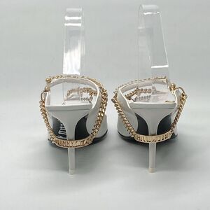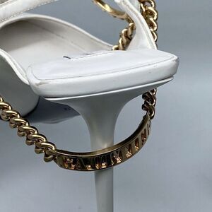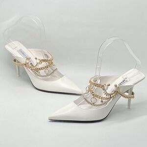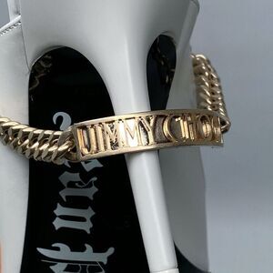 From the JIMMY CHOO / JEAN PAUL GAULTIER Collaboration. A classic Jimmy Choo style, the Bing mules are updated with two-tone chain hardware for a Jean Paul Gaultier flare.