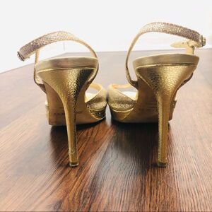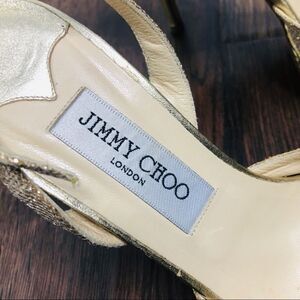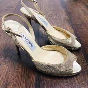 Jimmy Choo Clue Champagne Gold Glitter Platform 39 Shiny Strap Peep Toe