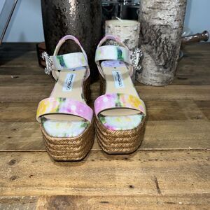 Mirabelle 70 sandals by Jimmy Choo crafted in printed canvas with adjustable ankle strap featuring silver-finished metal buckle embellished with crystals.