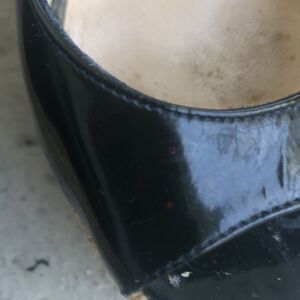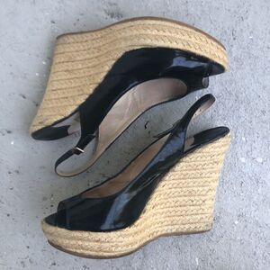 Is patent leather rope wedges are not new, so please look at the pictures. Back of the needs a little bit of cleanup, showing pictures that there’s a little square of glitter that I can’t get out but you probably can. Heel height is 4.5 inches platform height is 1 inch.