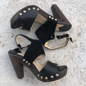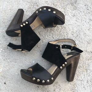 Super cute leather front straps with a velvety suede second draft that goes around the ankle. These are in very good condition but have one stop on the side of the inside with Shoe. I will polish it out before sending. Platform is 1” platform is 4.5 inches.