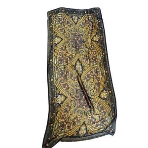 Elegant long rectangular scarf featuring a richly detailed paisley and floral motif in golden yellow, amber, green, and black tones. Made from a lightweight, silky-feel fabric that drapes beautifully and adds a touch of vintage-inspired sophistication to any outfit.