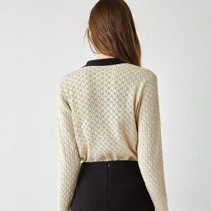 This soft cardigan features a contrast neckline with bow tie, long sleeves, and white buttons detailing. Available in white, black and beige. Cozy up while staying cool with a breezy cardigan.