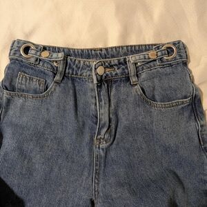 High-waisted, straight-leg, blue denim jeans with a relaxed fit. Nice soft denim with snaps to adjust the waist. Excellent condition. Tag is marked small, Waistline is 26 inches. #indiejeans #momjeans #bluejeans #y2k