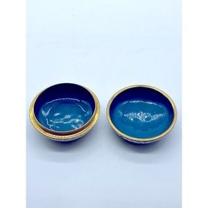 Perfect condition, this Jingfa cloisonne trinket box was made in China. Hand painted flowers, beautiful blue color inside, and gold painted rims. Stand about 1 3/4" H x 3 1/4" accross.