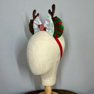 Featuring green sequin ears with glitter peppermint swirls, these Disney-inspired ears are topped with an iridescent bow embellished with a peppermint candy. The glittery brown reindeer antlers add a fun and festive touch to your Christmas festivities or park adventures! 🎀🎄