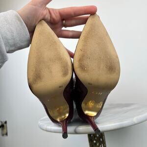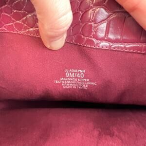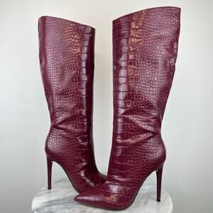 Jlo Jennifer Lopez Dark Red Adalynn Tall Stiletto Boots. Labeled a size 9 and fits true to size. High quality and in great condition, only worn once. Man made upper, interior zipper for easy put on, pointed toe, 4.5" heel, 15" shaft, and 16" calf circumference. Perfect statement boots for the holidays. Exterior has an animal skin pattern along it.