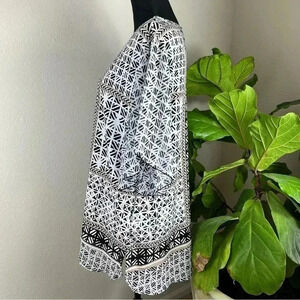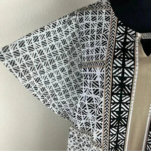 JM Collection, made for comfort, pullover, loose fitting top with decorative silver neckline in white, black, and tan, with sheer short-sleeves, hi low hem in EXCELLENT pre-owned condition! No holes or stains! Worn only once! Size: XL