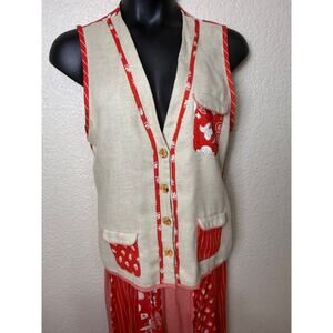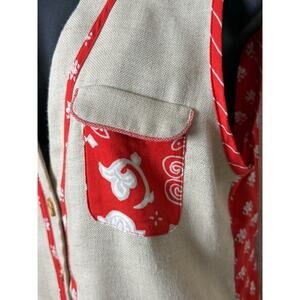 Long vest with tan linen blend, wood buttons, orange trim and floral fabric for 3 pockets. Back is orange floral, and has a linen tie.