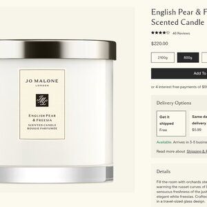 Luxurious Jo Malone candle with a refreshing English Pear & Freesia scent. Elegant white design with a silver lid.