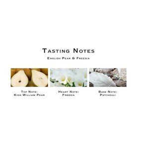 English Pear & Freesia: The sensuous freshness of just-ripe pears is wrapped in a bouquet of white freesias and mellowed by amber, patchouli and woods.