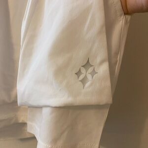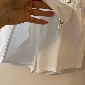 Like new. White tennis/active shorts with faux wrap front, elastic waistband, front and back pockets. Size L. Fits true to size or slightly larger. All white with silver reflective logo on front. (U)